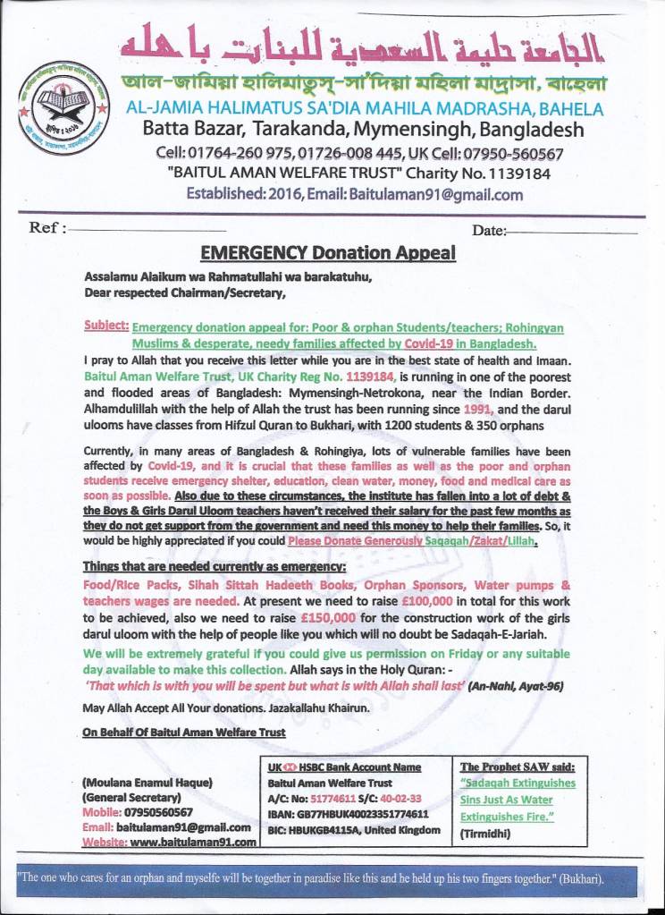 Baitul Aman Welfare Trust have been collecting funds towards the building of the Al Jamia Halimatus Sa’dia Girls’ Madrasa & Orphanage located in Mymensingh, Bangladesh. However, due to the lack of funds, flooding and the impact of COVID-19, construction work has been put on hold for some time. As a result, the orphanage, girls’ accommodation and classes have been adversely affected.